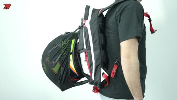 - Integrated Helmet Carry System: Eqzuipped with external straps or a mesh cradle (as seen holding the helmet) specifically designed to securely carry a full-face or open-face helmet, keeping it safe and easily accessible.