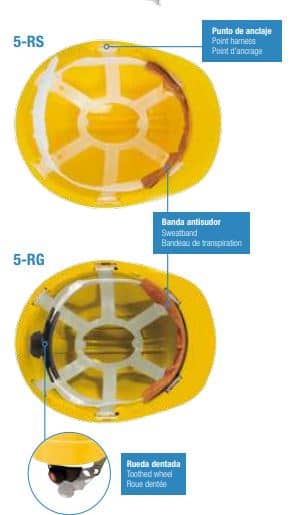 The main difference between the Safety Helmet 5RS and 5RG models is typically the type of harness adjustment: the 5RS generally features a manual/slip ratchet adjustment, while the 5RG model often includes a ratchet (toothed wheel) adjustment for quicker, one-hand sizing. However both of the harnesses are available with AKB SAFETY.