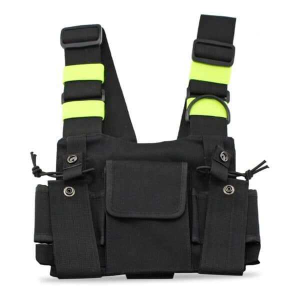 - Dedicated Radio Pouches: Features secure, adjustable pouches (visible on the sides) specifically designed to hold two-way radios, walkie-talkies, or other communication devices, keeping them snug and accessible.