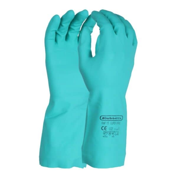 SUPER NITRILE RNF 15 Gloves are a premium solution for industrial and heavy-duty tasks requiring superior hand protection. Constructed from high-grade Acrylonitrile Butadiene (Nitrile) rubber, these gloves are engineered to provide exceptional, proven durability against a wide array of harsh chemicals, solvents, oils, fats, and caustic agents. The interior features a comfortable flocklined (cotton) finish, ensuring comfort during long periods of wear while also promoting reduced hand fatigue and easy donning. Certified to meet stringent EN standards for chemical and mechanical protection, the RNF15 is the ideal choice for demanding environments.